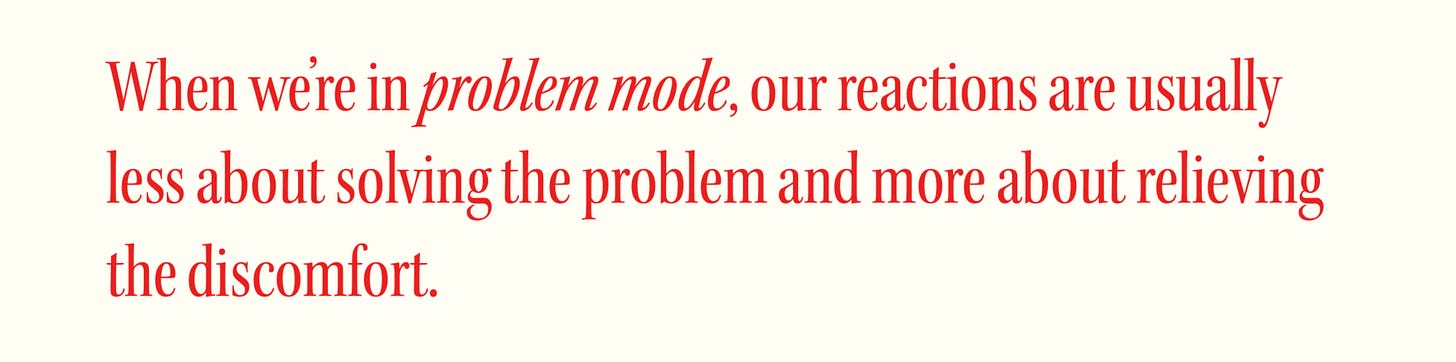 So when we’re in problem mode, our reactions are usually less about solving the problem and more about relieving the discomfort. We become reactive. We default to whatever version of fight, flight, or freeze is most natural for us.